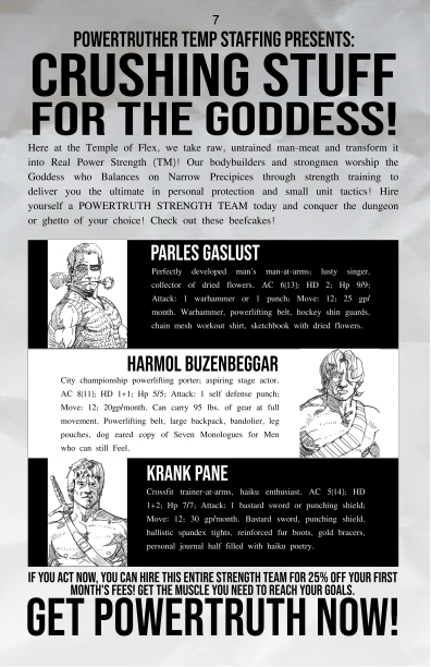 The Mutant Insurrectionist, featuring news snippets, gang territories, new items/spells/classes/monsters, playable locations, and absurdist advertisements. Here's a news snippet from the monthly magazine for the rich part of town, which includes a custom 1st level Mentalist spell: